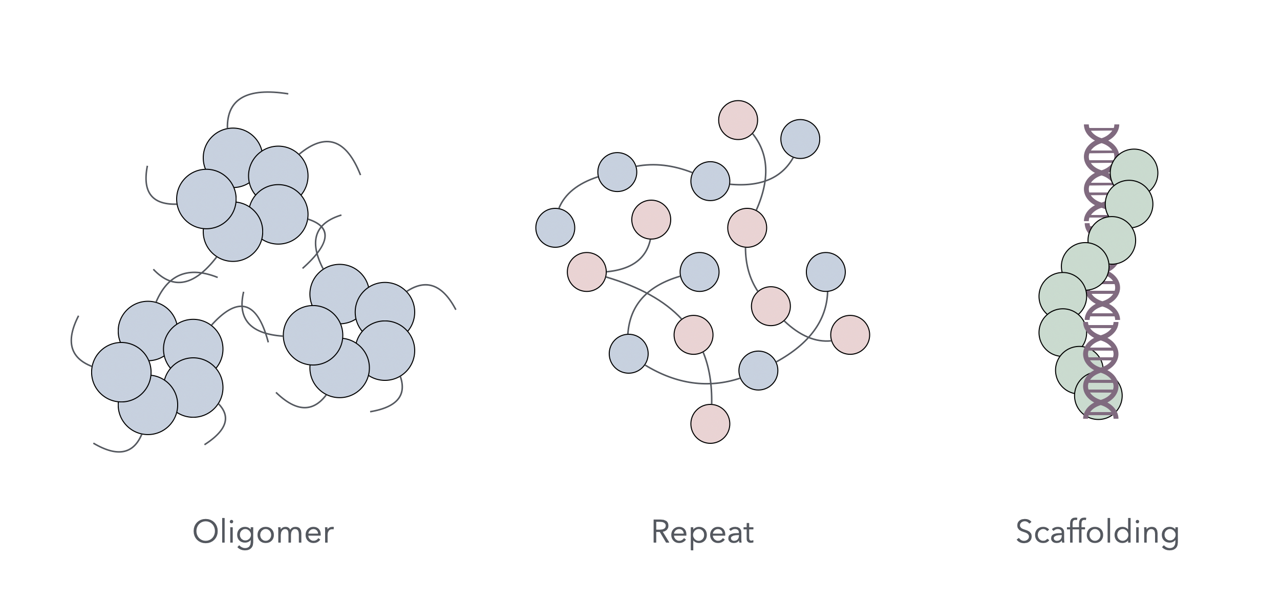 - Non-Specific Scaffolding: if the interaction is nonspecific, then it may happen at many places on a molecule. For instance, histones bind DNA nonspecifically, enabling chromatin to transition between phases during mitosis.