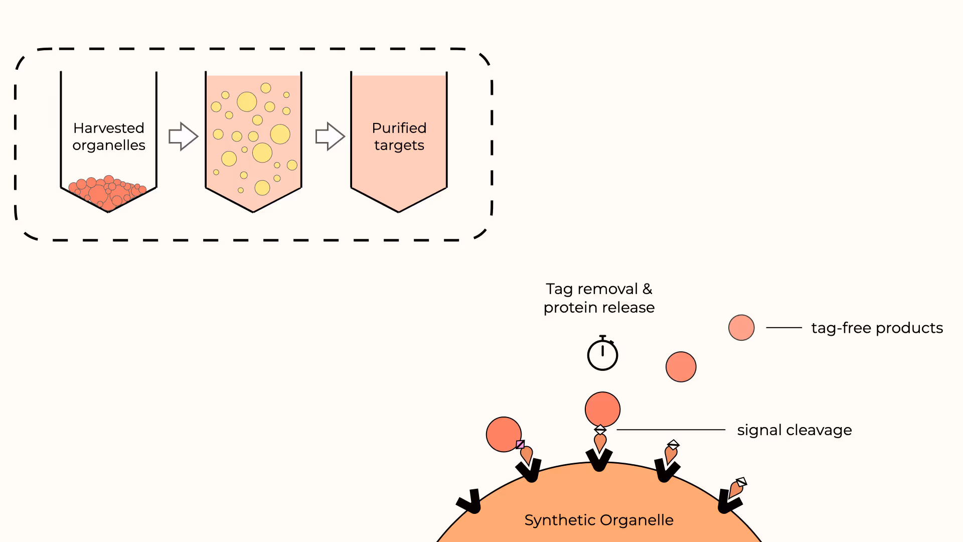 The tag-less protein is then released from the large organelles and recovered through simple separation.